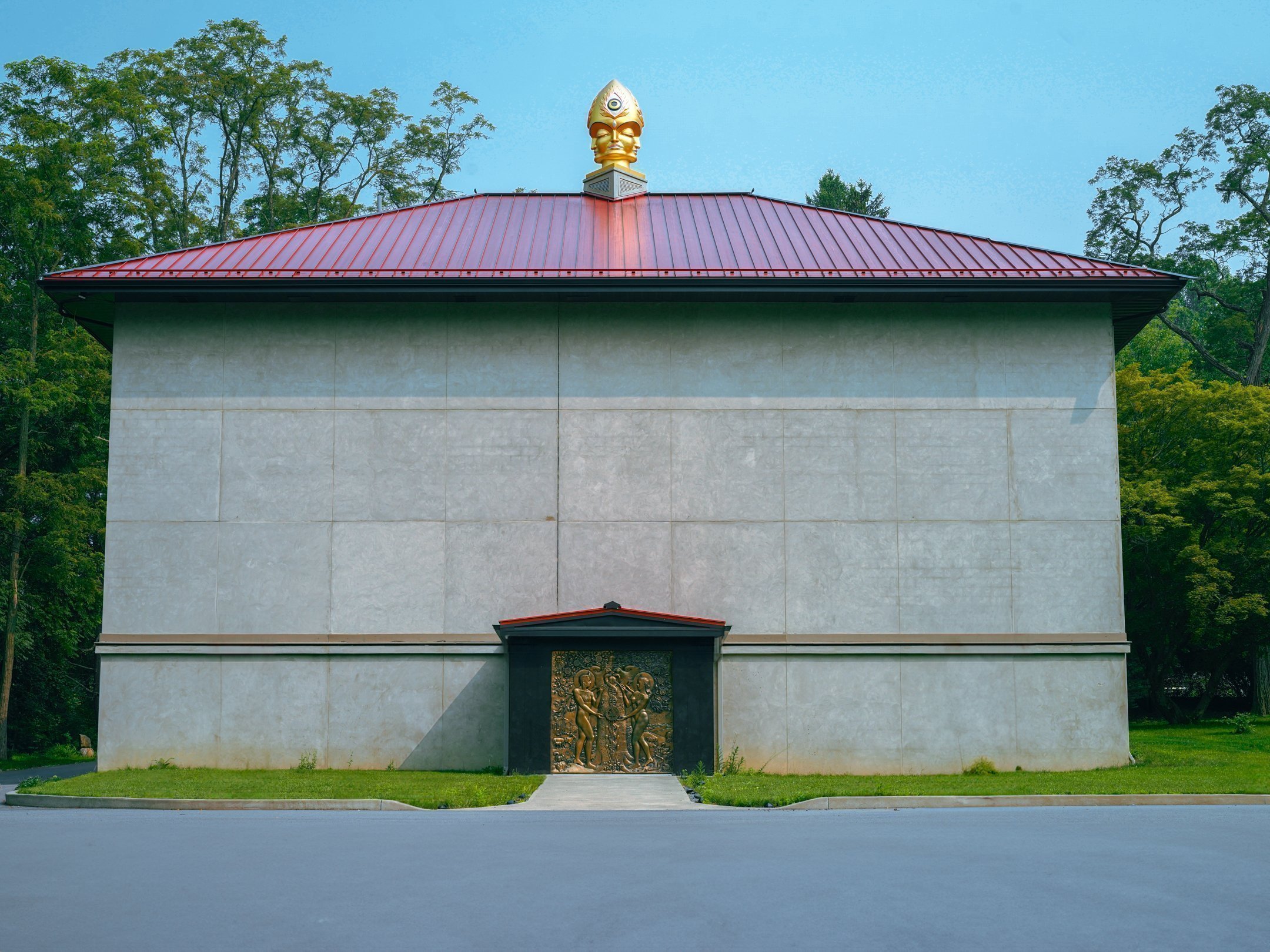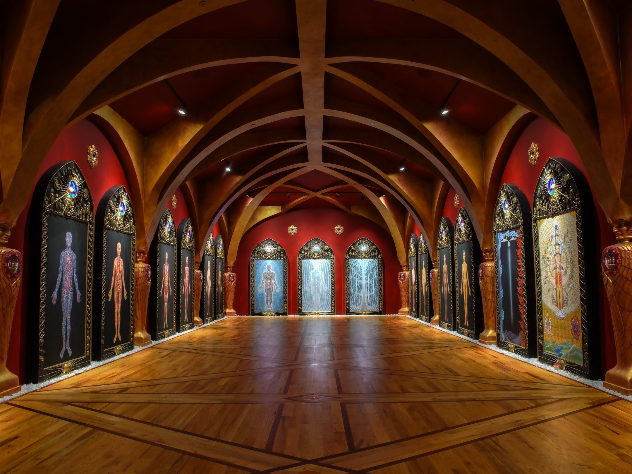 Entheon, Sanctuary of Visionary Art at CoSM, transforms a three-story carriage house into a stunning 12,000 square foot exhibition of the finest original works of Visionary Art, precious paintings, drawings, sculpture and moving image, that resonates with the highest states of consciousness. Inside Entheon, the Chapel of Sacred Mirrors features a cathedral-esque latticework ceiling, ten archangels, and a quartz crystal moat that surrounds each of the twenty-one Sacred Mirrors.