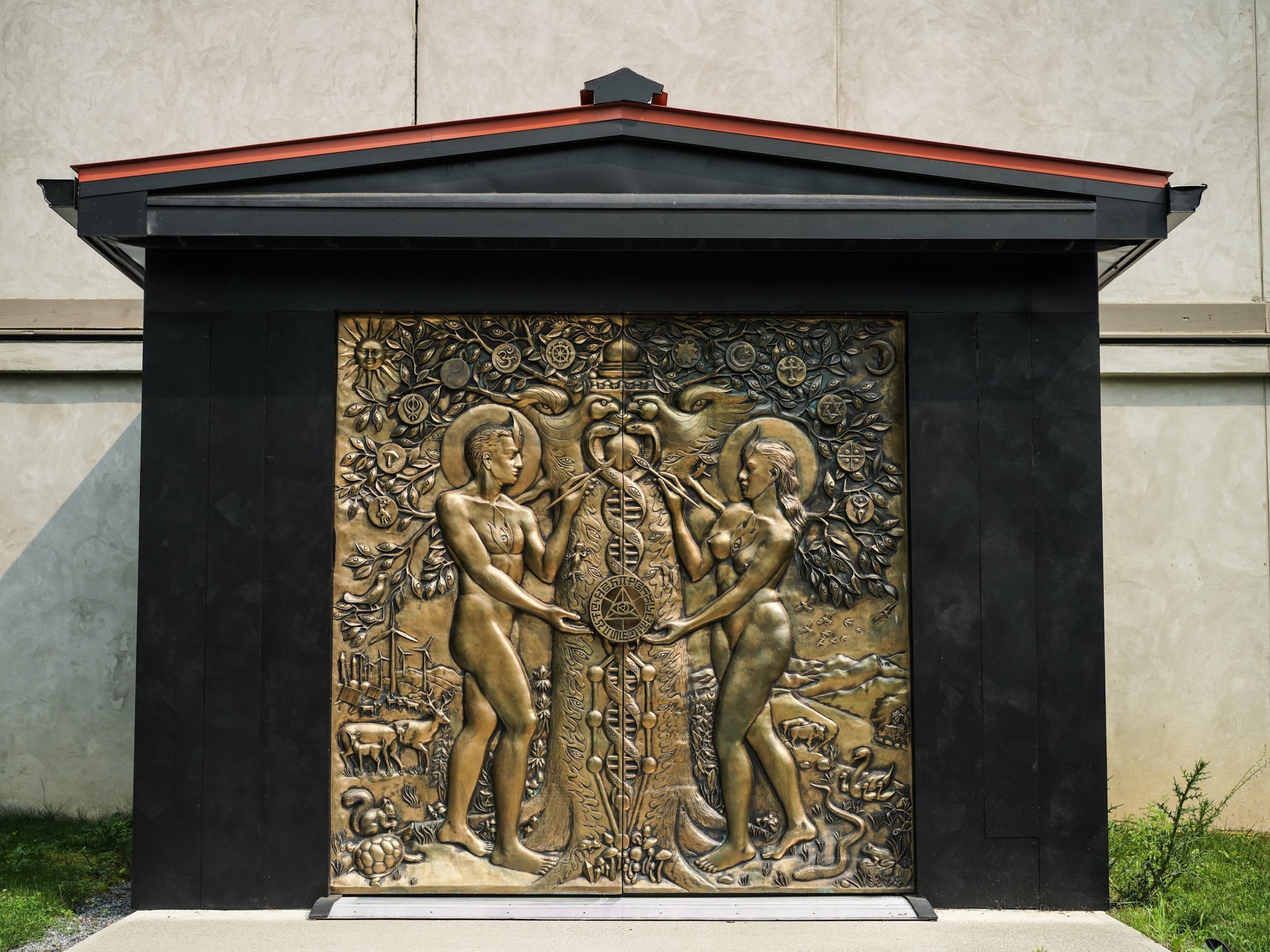 The Entheon Portal features bronze sculptural doors, a work of art entitled Creating a Better World, by Alex Grey. Artists, Adam & Eve, return to the Garden to paint a new world and harvest the Tree of Wisdom.