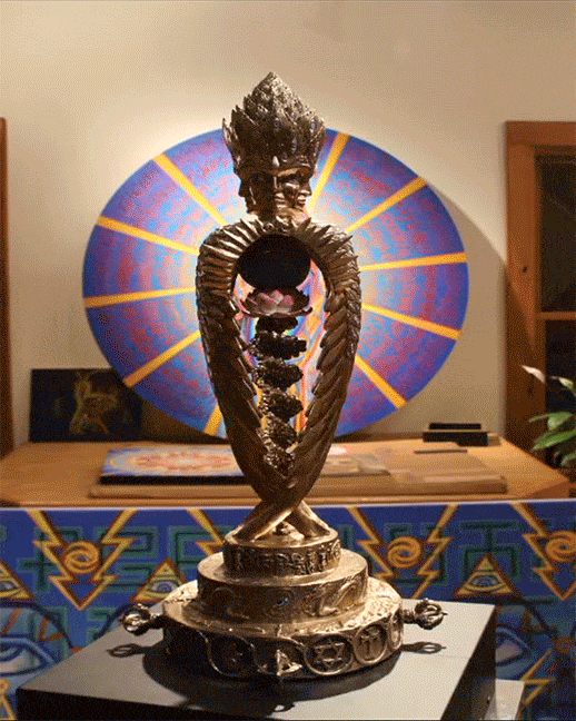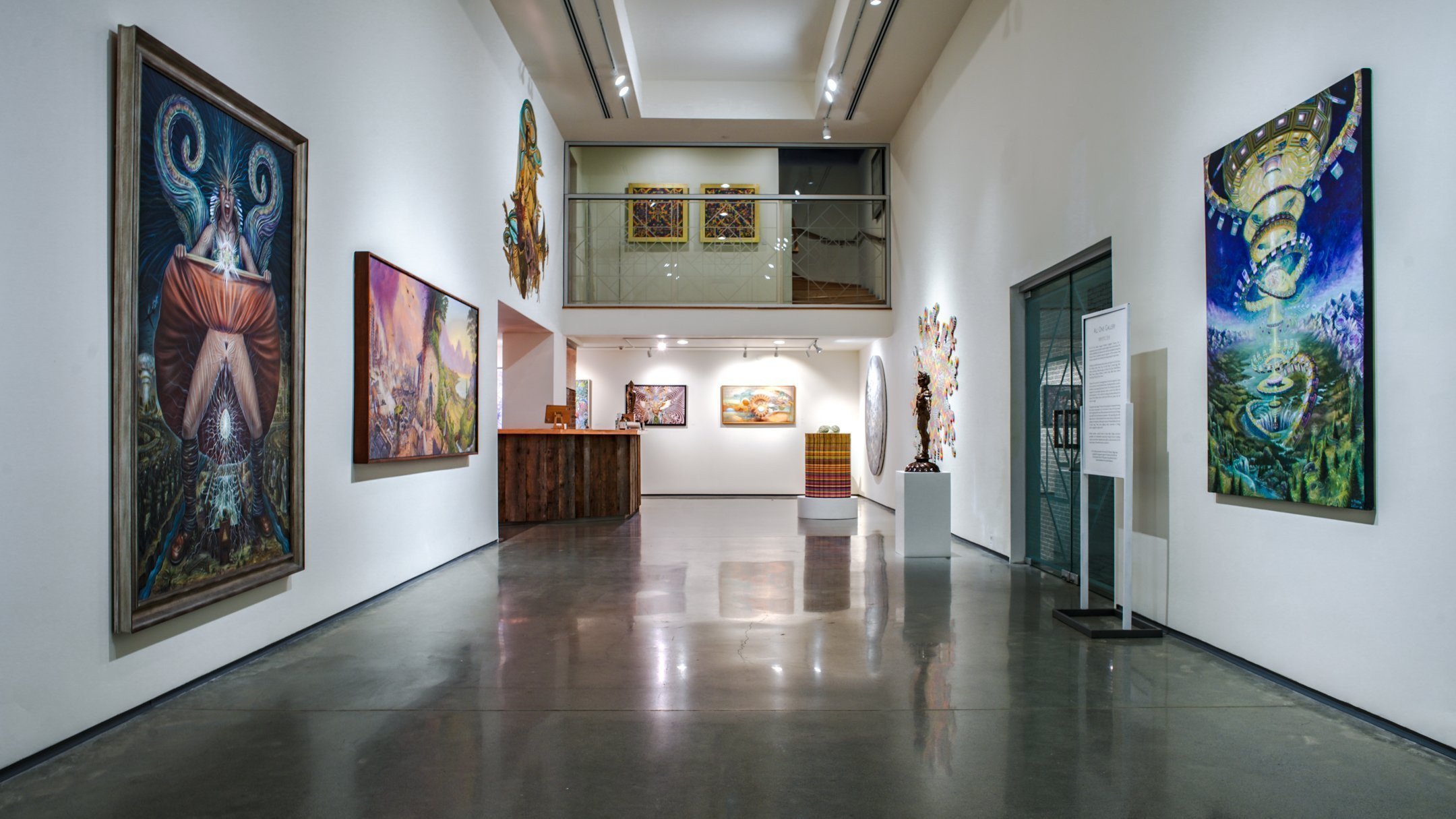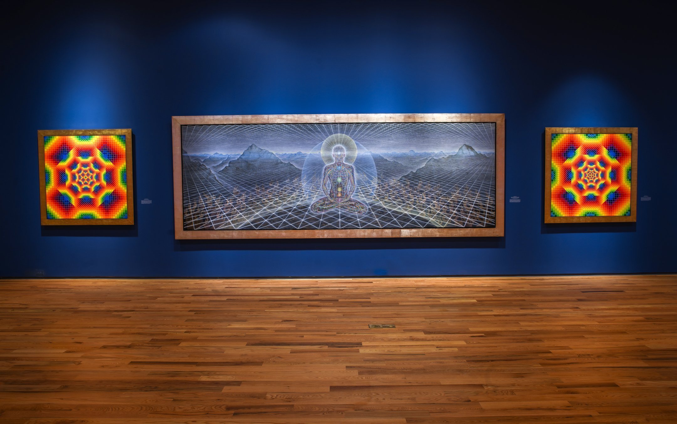 On display in The Great Hall are transcendental works including Alex Grey’s beloved paintings, Net of Being (featured by the band Tool), Theologue (meditating figure), Cosmic Christ, and the winged bronze sculpture, World Soul.
