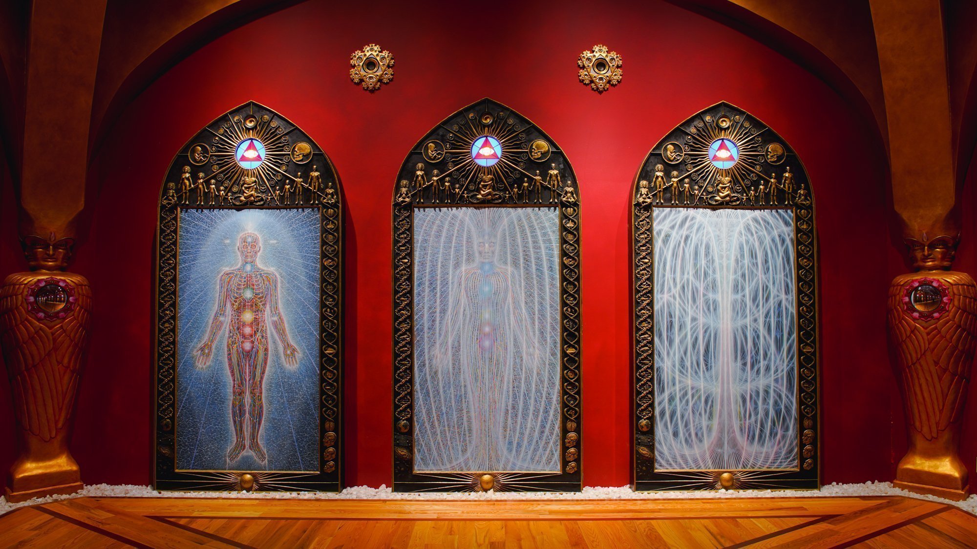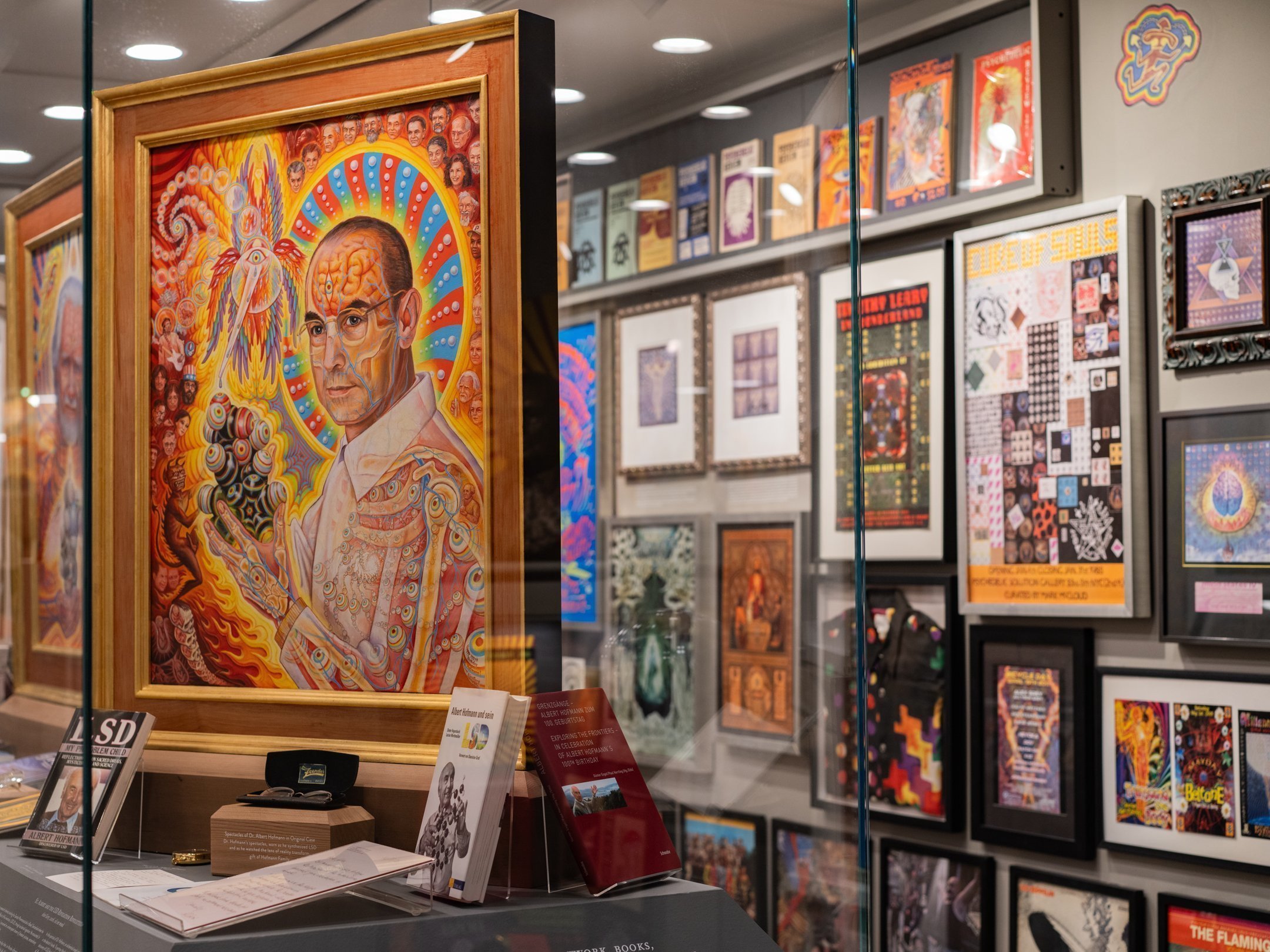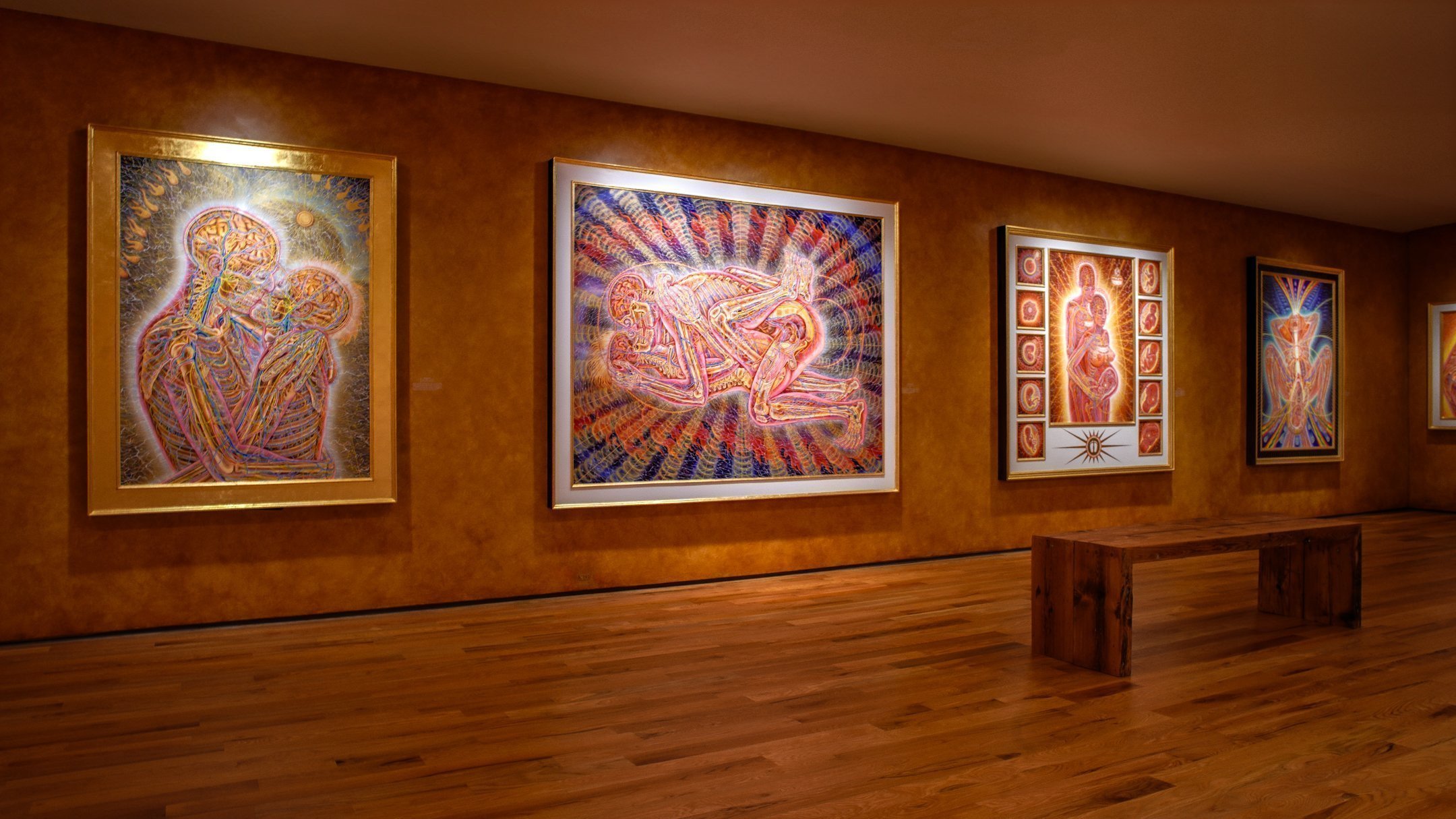 The Psychedelic Reliquary hosts treasured artifacts and ephemera, including the spectacles of Dr. Albert Hofmann and the ashes of Timothy Leary. A shrine inside the Reliquary Room is dedicated to Alex’s artistic collaboration with Grammy Award winning band, Tool.